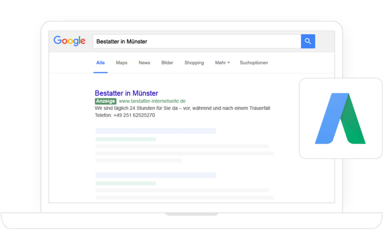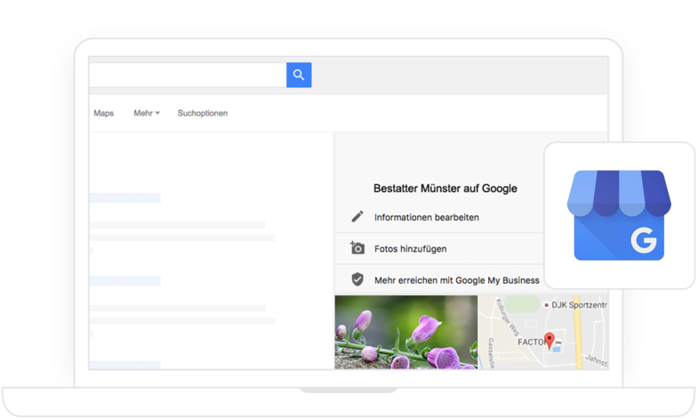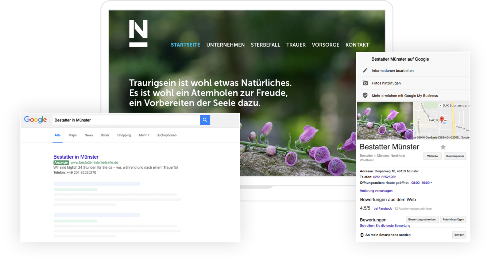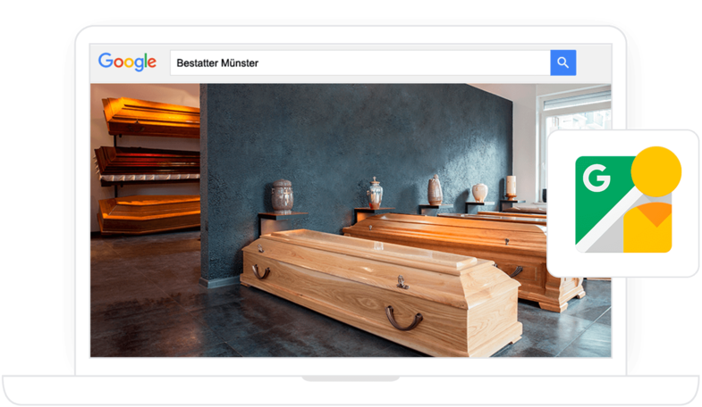 Wir erstellen Ihren My Business Eintrag, mit dem alle relevanten Informationen über Ihr Bestattungsunternehmen in der Google-Suche, in Google Maps und auf Google+ erscheinen.