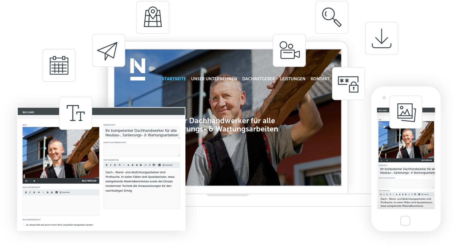 Das Herzstück von NETZCOCKTAIL ist ein flexibles und benutzerfreundliches Content-Management-System (CMS), das die Pflege Ihrer Website-Inhalte zum Kinderspiel macht. Das CMS verfügt über zahlreiche Funktionen, die es Ihnen ermöglichen, alle Inhalte jederzeit selbst zu bearbeiten. Und für alle Dachhandwerker, die etwas mehr möchten, bietet das NETZCOCKTAIL CMS auch Funktionen für Ihr Online-Marketing, die Suchmaschinenoptimierung, Social-Media und die Verwaltung von Benutzern, Rechten, E-Mails u.v.m.