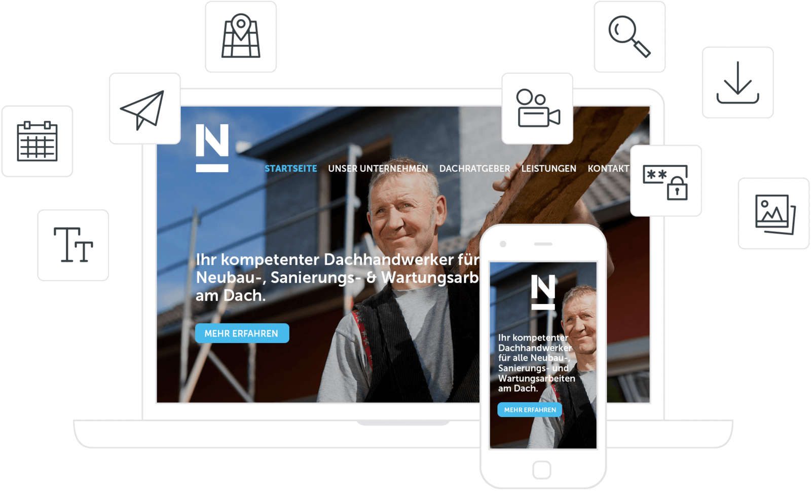 Wir stellen Ihnen eine fertige Seitenstruktur aus mindestens 20 Menüpunkten inkl. Bilderpool und Texten zu Ihren Leistungen, Referenzen, Ihrem Unternehmen u.v.m. zur Verfügung