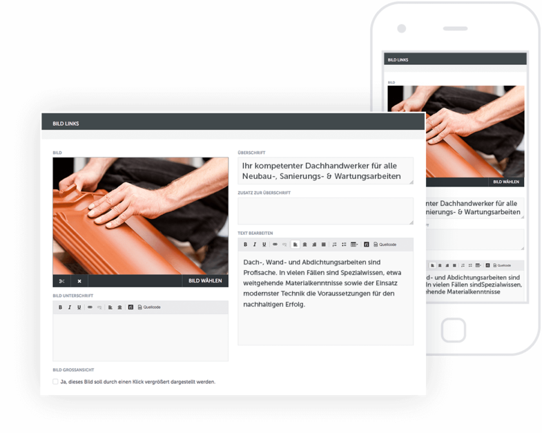 Zahlreiche Funktionen ermöglichen es Ihnen, Ihren Internetauftritt jederzeit selbst zu bearbeiten – bequem von zu Hause aus am Computer oder unterwegs auf Ihrem Smartphone. Ob Google Maps, Videos, Referenzprojekte oder Kontaktformulare – Alle Funktionen des CMS sind zu 100 % DSGVO-konform.