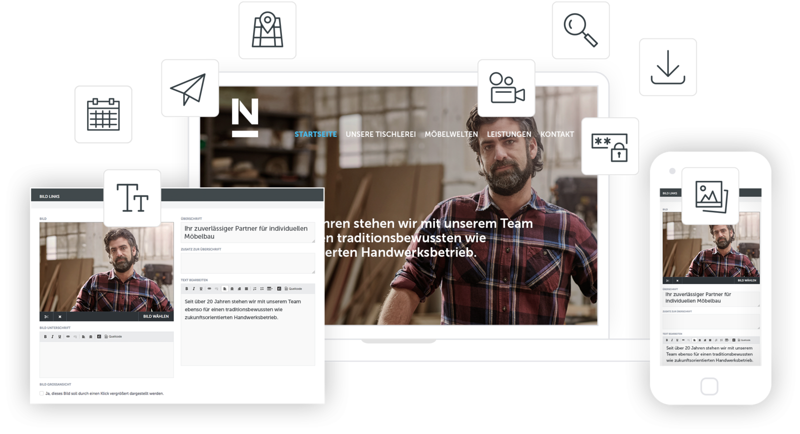 Das Herzstück von NETZCOCKTAIL ist ein flexibles und benutzerfreundliches Content-Management-System (CMS), das die Pflege Ihrer Tischler-Website zum Kinderspiel macht. Das CMS verfügt über zahlreiche Funktionen, die es Ihnen ermöglichen, alle Inhalte jederzeit selbst zu bearbeiten. Und für alle Tischler, die etwas mehr möchten, bietet das NETZCOCKTAIL CMS auch Funktionen für Ihr Online-Marketing, die Suchmaschinenoptimierung, Social-Media und die Verwaltung von Benutzern, Rechten, E-Mails u.v.m.