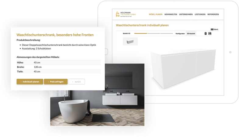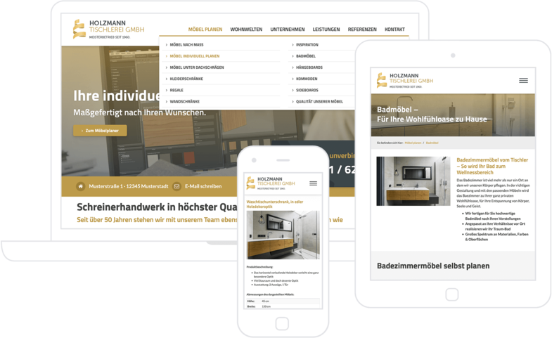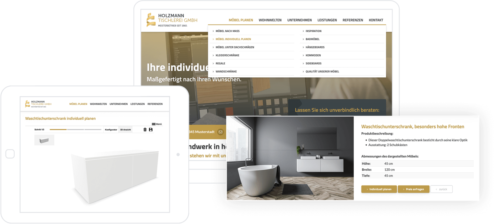 Eingebunden in Ihre komplett individuelle Website, schaffen wir mit dem Möbelplaner einen modernen Internetauftritt, der zeitgemäß und funktional ist, vor allem aber zu Ihrem Unternehmen passt.