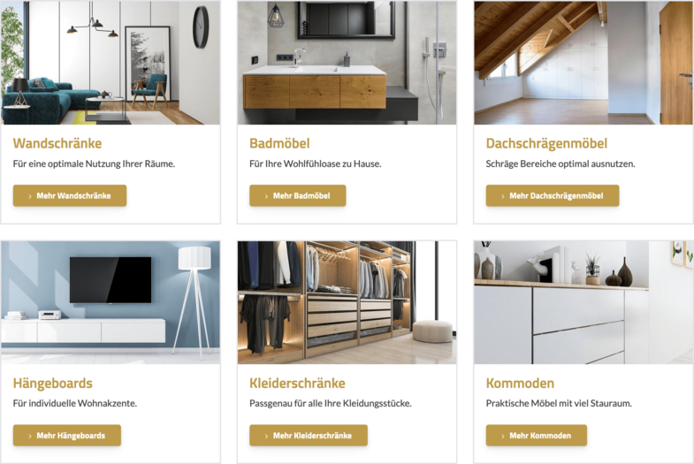 Über 100 vorgeplante Möbel lassen sich in verschiedenen Kategorien auf Ihrer Wesbsite integrieren, überall dort, wo Sie den Websitebesucher auf Ihren Möbelplaner leiten möchten. Jedes Möbel erhält eine Produktdeteilseite mit Detailinformationen und kann mit wenigen Klicks individualisiert und angefragt werden.