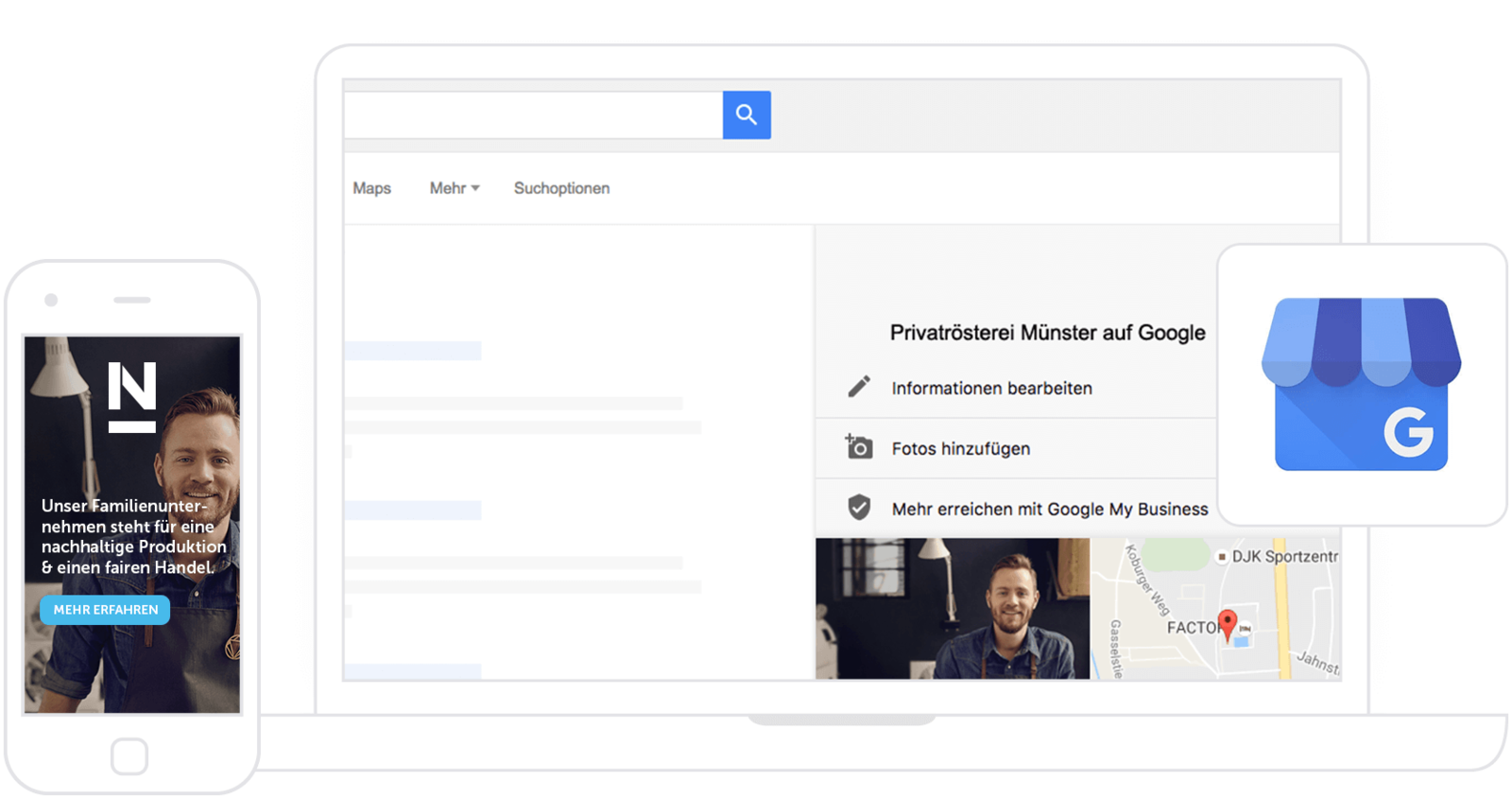 Gerne sind wir Ihnen bei der Einrichtung von Google My Business behilflich und sorgen dafür, dass die richtigen Informationen über Ihr Unternehmen erscheinen, wenn ein Nutzer in der Google-Suche und Maps nach Ihrem Geschäft suchen.