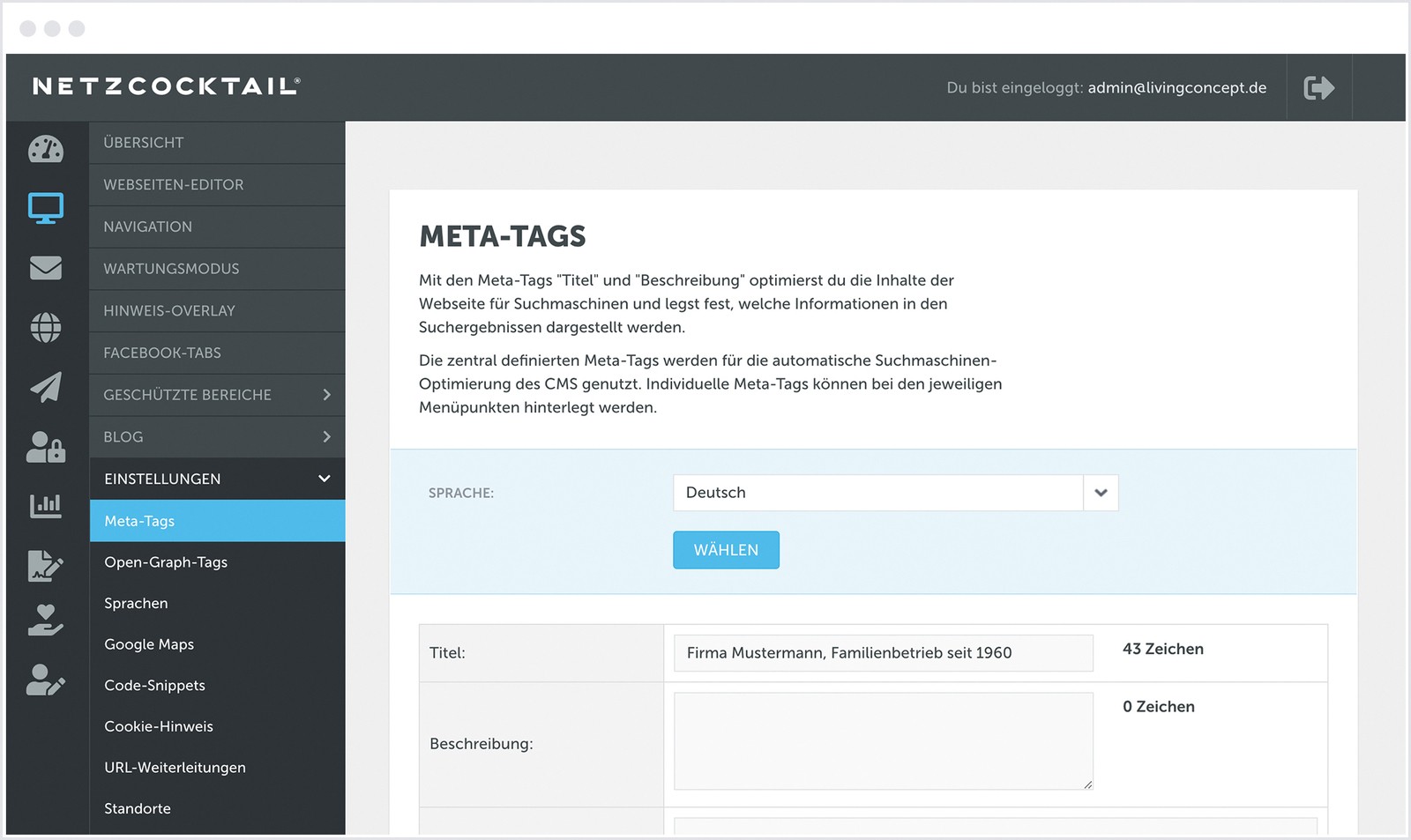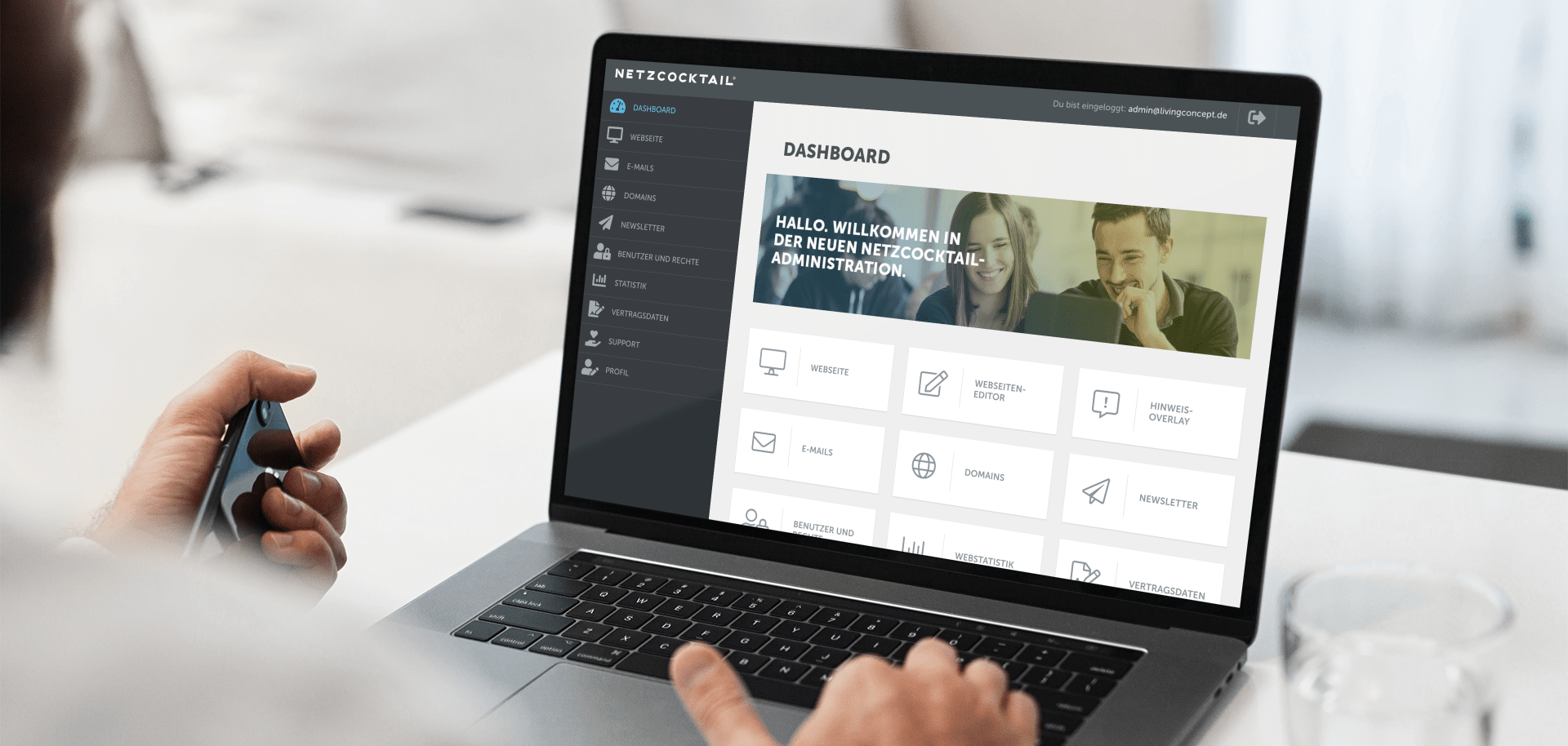 Über das neue NETZCOCKTAIL-Dashboard sind ab sofort alle Bereiche verlinkt, die für die Bearbeitung der Webseite zur Verfügung stehen. Alle Bereiche sind sowohl über die neue linke Navigation als auch über Teaser auf dem Dashboard erreichbar. Die Zugangsdaten werden ab sofort im Profil-Bereich bearbeitet, nicht mehr unter Vertragsdaten. Hier sind auschließlich Informationen zum Vertrag sichtbar.