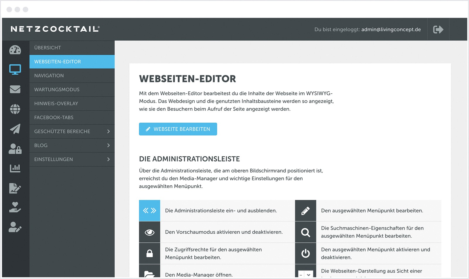 Die Bearbeitung der Webseiten-Inhalte erfolgt über den Webseiten-Editor, die der Newsletter-Inhalte über den Newsletter-Editor. Auf den Übersichtsseiten befindet sich weiter die Erklärung der wichtigsten Icons und Funktionen, sowie der Button "Webseite bearbeiten" der den Editor öffnet.