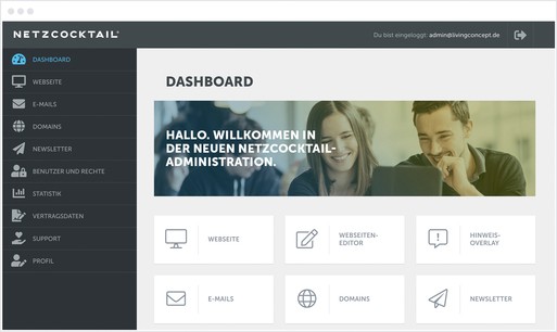 Über das neue NETZCOCKTAIL-Dashboard sind ab sofort alle Bereiche verlinkt, die für die Bearbeitung der Webseite zur Verfügung stehen. Alle Bereiche sind sowohl über die neue linke Navigation als auch über Teaser auf dem Dashboard erreichbar. Die Zugangsdaten werden ab sofort im Profil-Bereich bearbeitet, nicht mehr unter Vertragsdaten. Hier sind auschließlich Informationen zum Vertrag sichtbar.