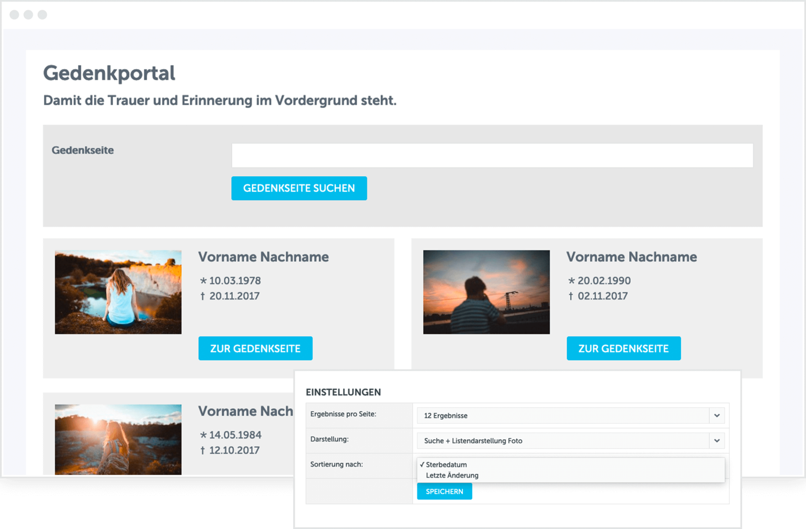Die Sortierung im Gedenkportal-Baustein kann nach Sterbedatum oder letzter Änderung eingestellt werden.