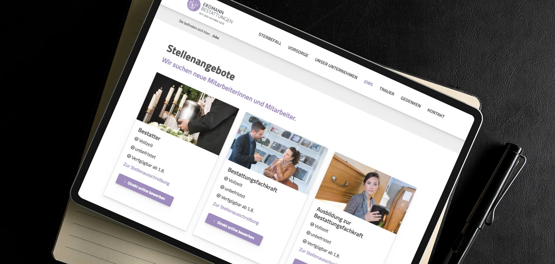 Der Stellenangebote-Baustein ermöglicht dir die unkomplizierte Veröffentlichung von Stellenanzeigen auf deiner Webseite. Alle Daten werden speziell für die Google-Suche optimiert, damit potenzielle Mitarbeiter diese bereits in der lokalen Google-Suche finden. Unseren Bestatter-Kunden können wir darüber hinaus Vorlagen für die Stellenangebote "Bestatter", "Bestattungsfachkraft" und "Ausbildung zur Bestattungsfachkraft" zur Verfügung stellen.