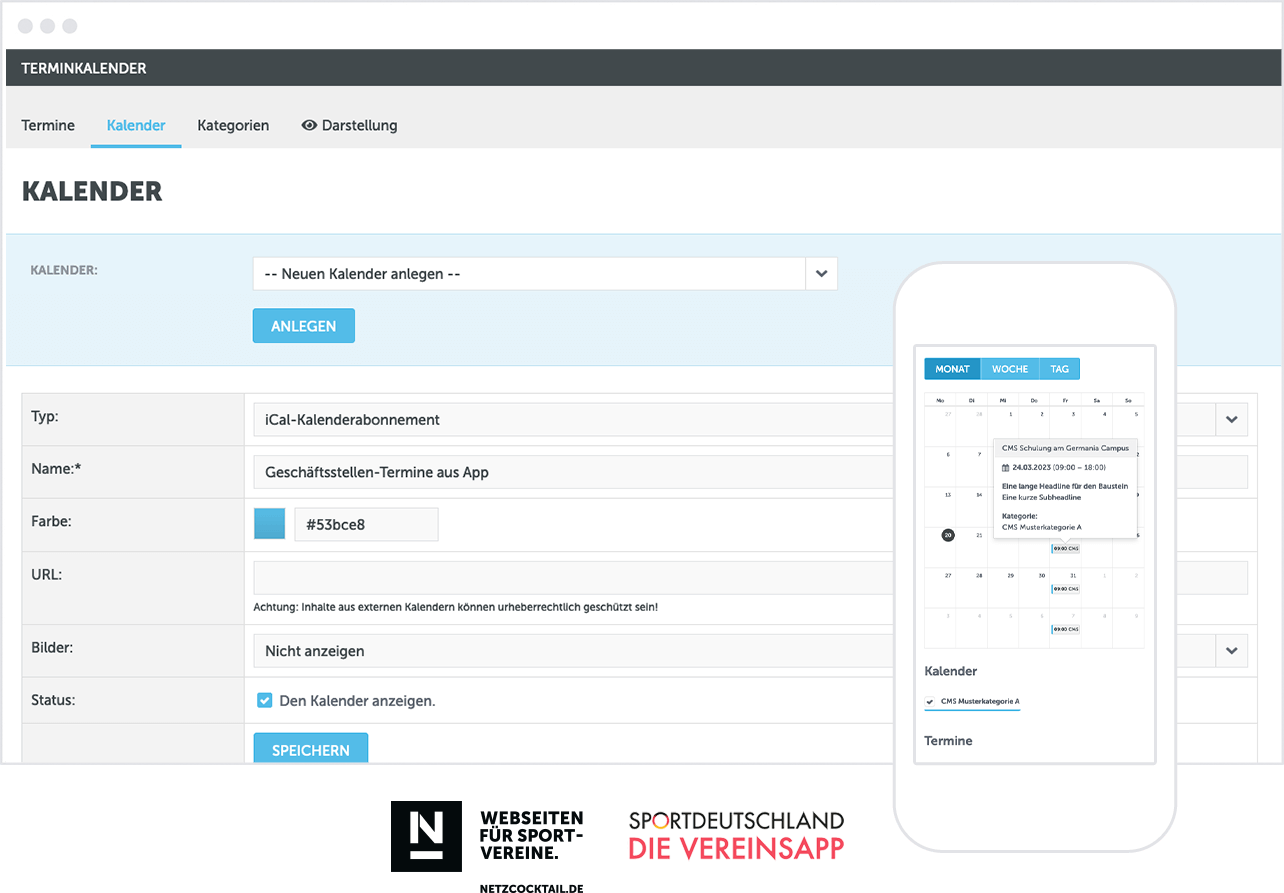 Durch die Möglichkeit iCal-Kalenderabonnements im neu entwickelten Terminkalender-Baustein zu hinterlegen, können die Termine aus anderen Systemen, wie z.B. der Sportdeutschland Vereinsapp oder Google Calendar einfach auf der Webseite ausgegeben und aktuell gehalten werden. Es müssen keine Termine mehr doppelt gepflegt werden.