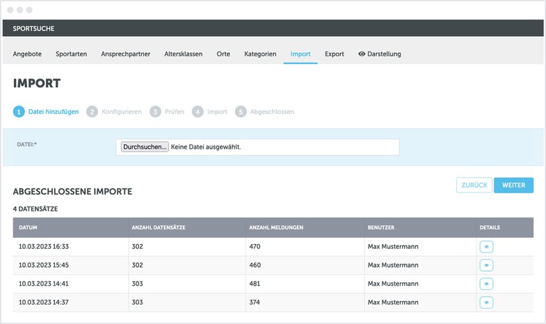 Der neue Import für die Sportangebote leitet Schritt für Schritt durch den Prozess.