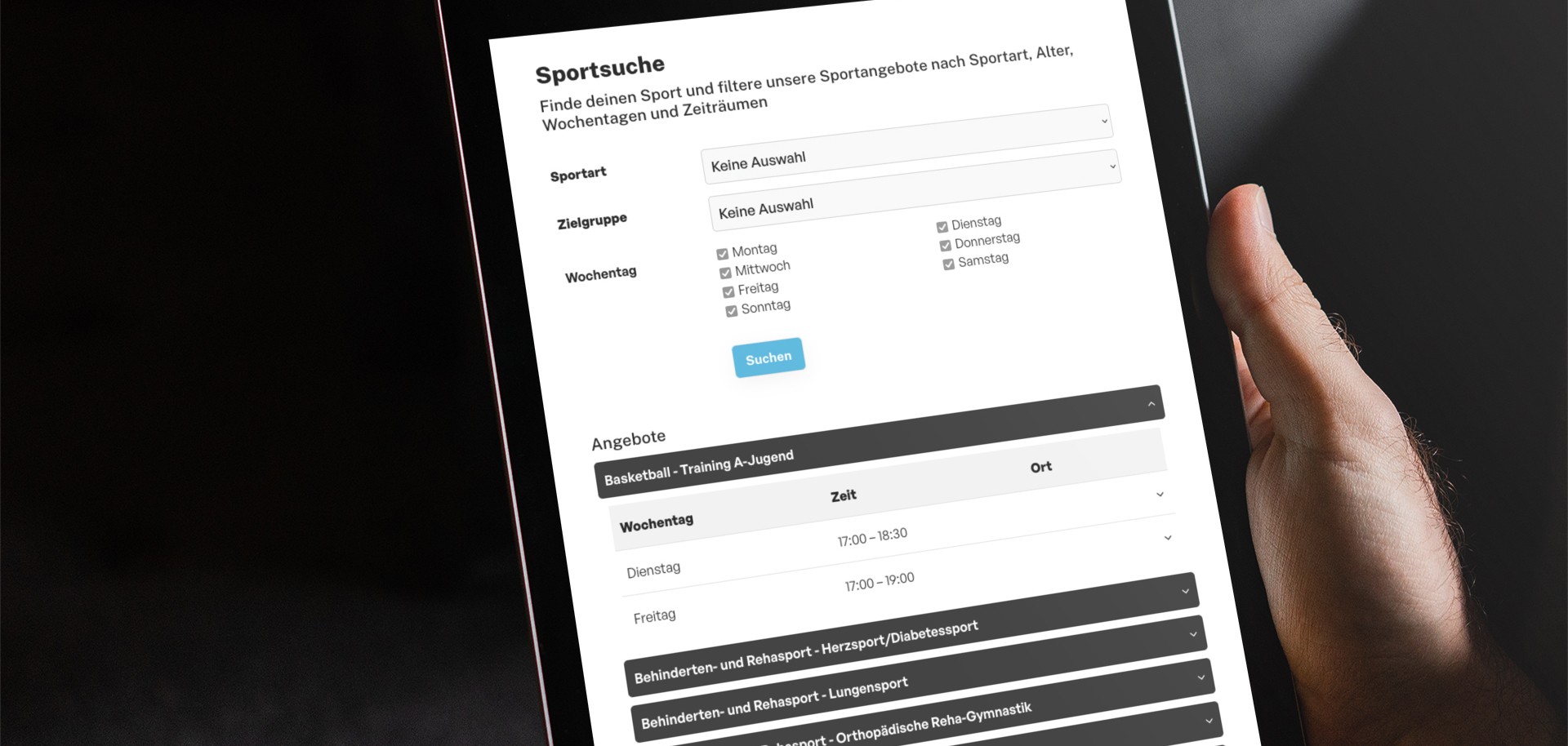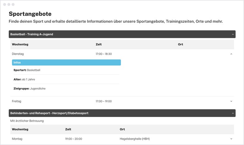 Im Rahmen unserer Webseitenlösung für Sportvereine haben wir den ⛹️ Sportsuche-Baustein von Grund auf neu entwickelt. Dabei stand die zentrale Verwaltung und Darstellung der Sportangebote auf der Webseite im Fokus.