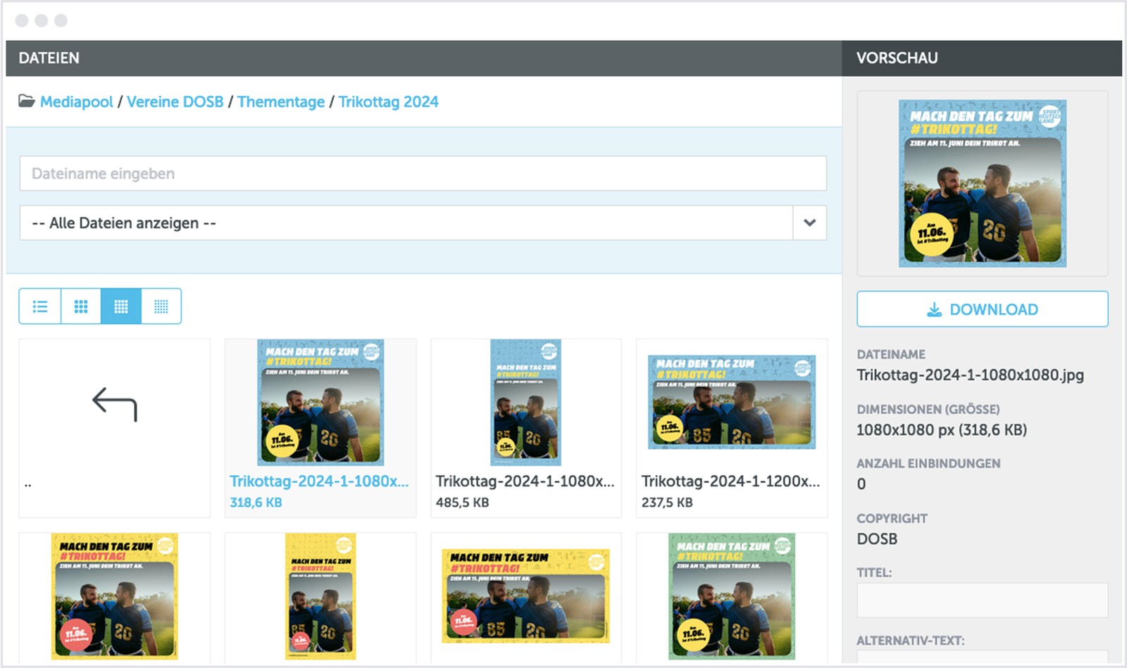 Alle Vereine und Verbände, die unser Digitalisierungsangebot 👩💻 "Sportdeutschland – Deine Vereinswebsite" nutzen, profitieren davon, dass u.a. der DOSB lizenzfreie Icons und Bilder über das NETZCOCKTAIL-System zur freien Verfügung bereitstellt. Dazu zählen z. B. die gesamten Sportdeutschland-Piktogramme und viele Kampagnenmotive zum Sportabzeichen etc.