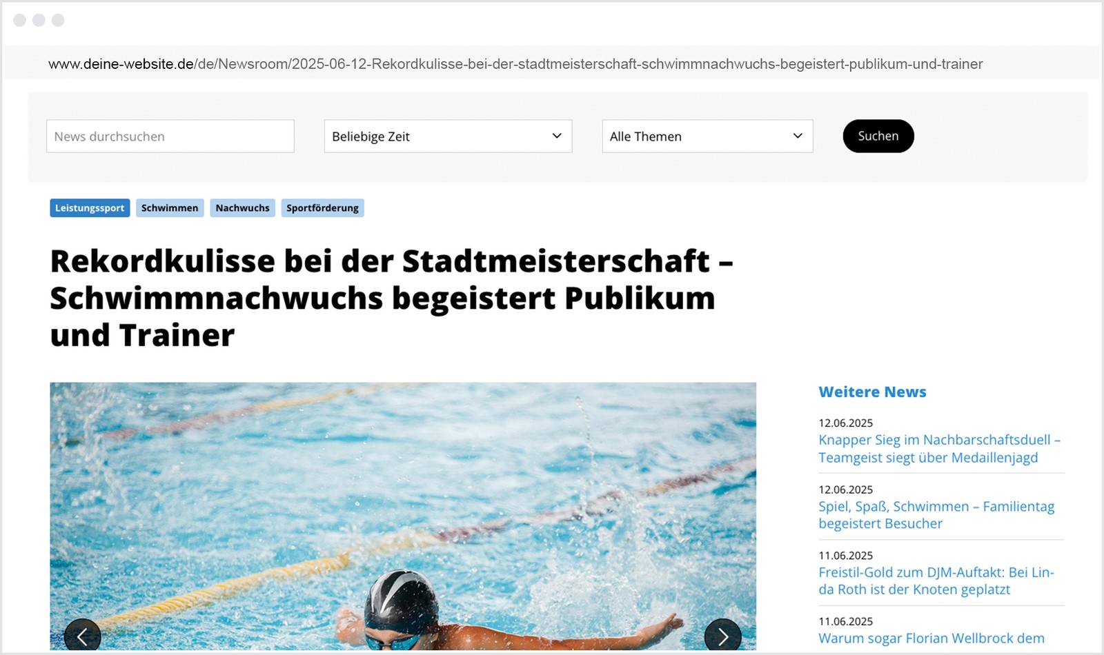 👉 Der bisherige News-Baustein bleibt aktiv und kann wie gewohnt genutzt werden. Wer auf den neuen Newsroom umsteigen möchte, kann sich einfach bei unserem Kundenservice melden. Wir übernehmen auf Wunsch die strukturierte Migration eurer bestehenden Newsinhalte.