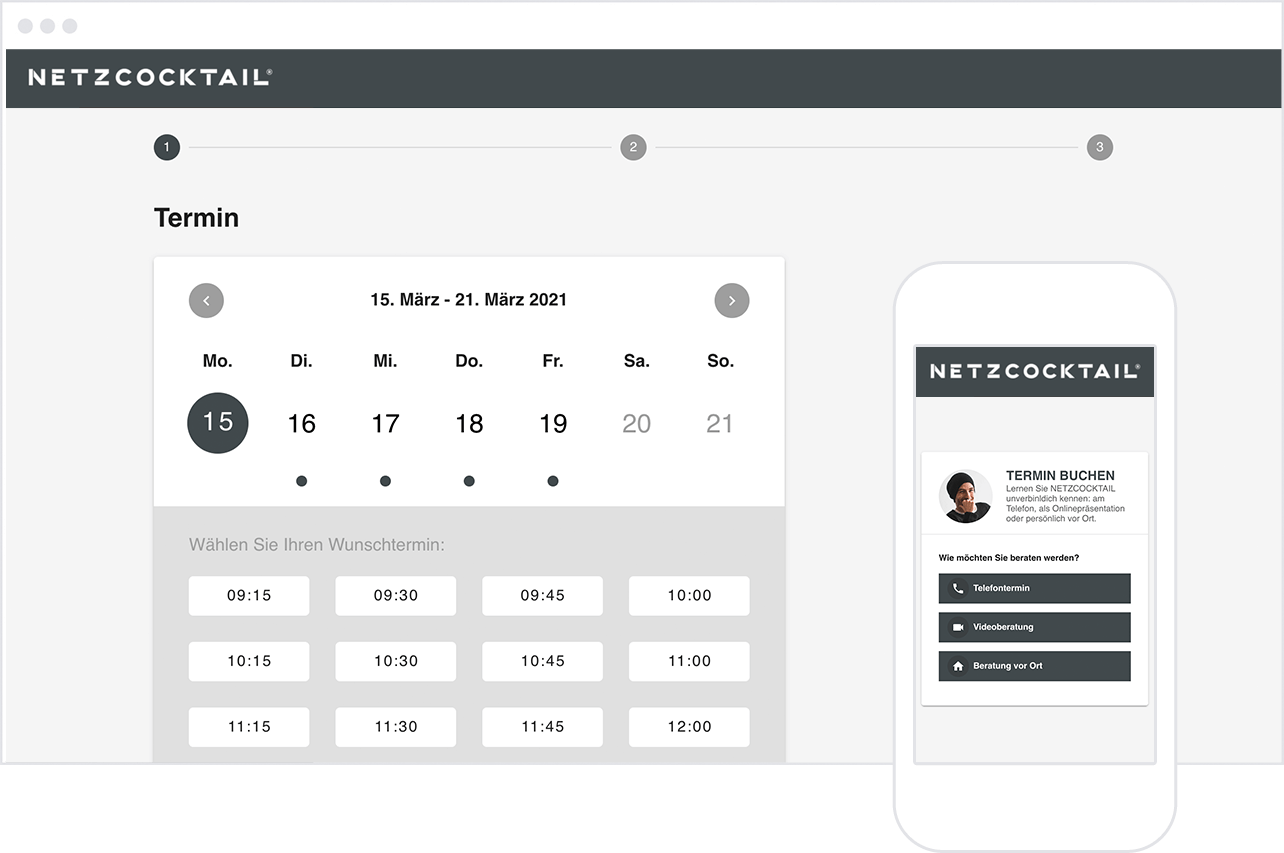 Mit Akeyi lassen sich online Termine auf deiner NETZCOCKTAIL-Webseite buchen. Ob Onlineberatungen z. B. per integrierter Videokonferenz via Jitsi, Servicetermine, Online-Bewerbergespräche oder Terminvereinbarungen für einen Vor-Ort-Besuch - Akeyi ermöglicht die einfache Terminbuchungen auf der Webseite.